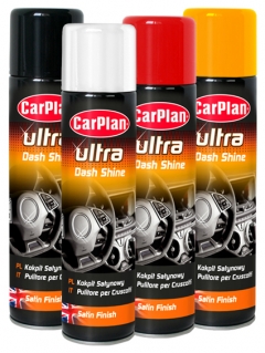 CarPlan Ultra Dash Shine is a new waterbased formula which efficiently and effectively cleans and restores interior plastic trims and PVC. Gives the original look of the new, fresh plastic. Elegant satin finish without excessive gloss, eliminates annoying glare while driving. Available in several fragrances.